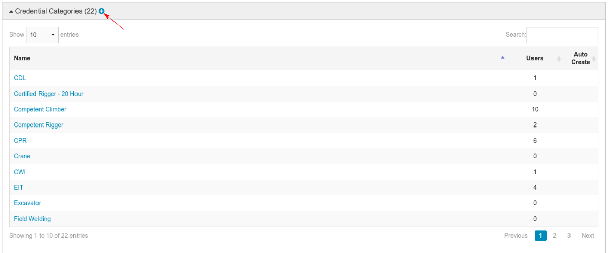 Find the "Credential Categories" section. Clicking on the bar will expand it and show of of your companies currently defined categories. Click on the blue "+" in the bar to go to add a new category.
