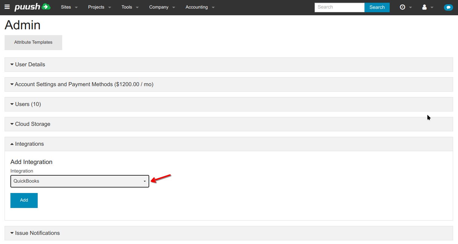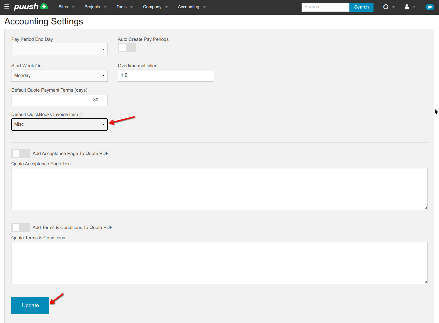 - Scroll Down to the Accounting Categories Section. Categories defined here can be used to organize Project and Site budget line items. Puush will attempt to match these categories with QuickBooks Products & Services with the same name. In QuickBooks, ensure that each category is created as a Non-Inventory Product or as a Service.