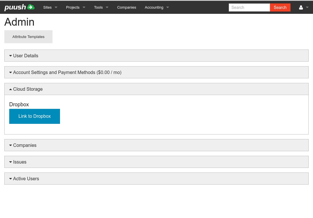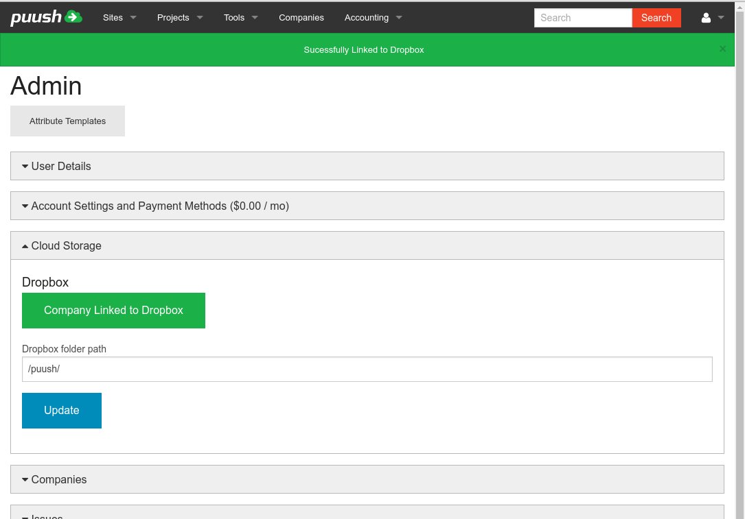 Once you have enabled a Dropbox account, all files attached to deliverables will be synchronized with Dropbox. Your users will also be able to directly upload files to project/site folders in Dropbox. These files are not stored in puush. Files will be placed in folders in the following format: