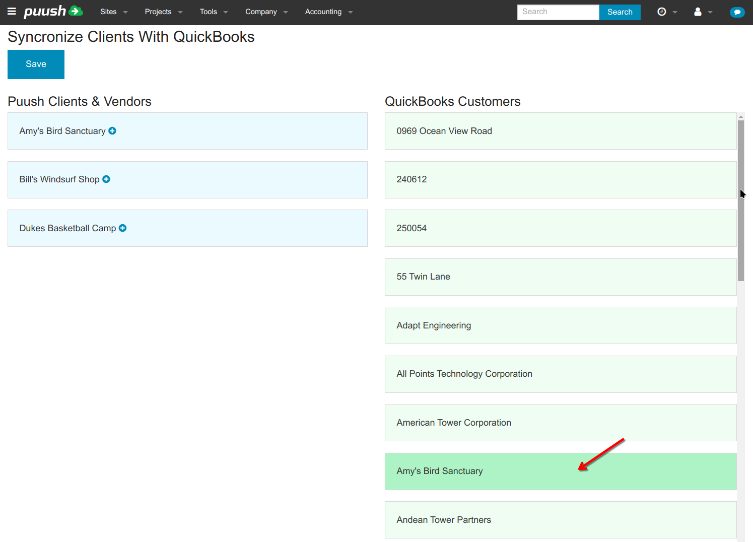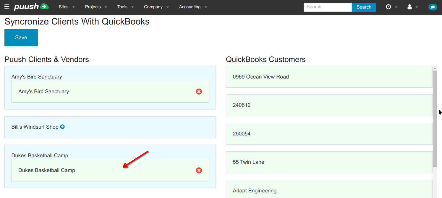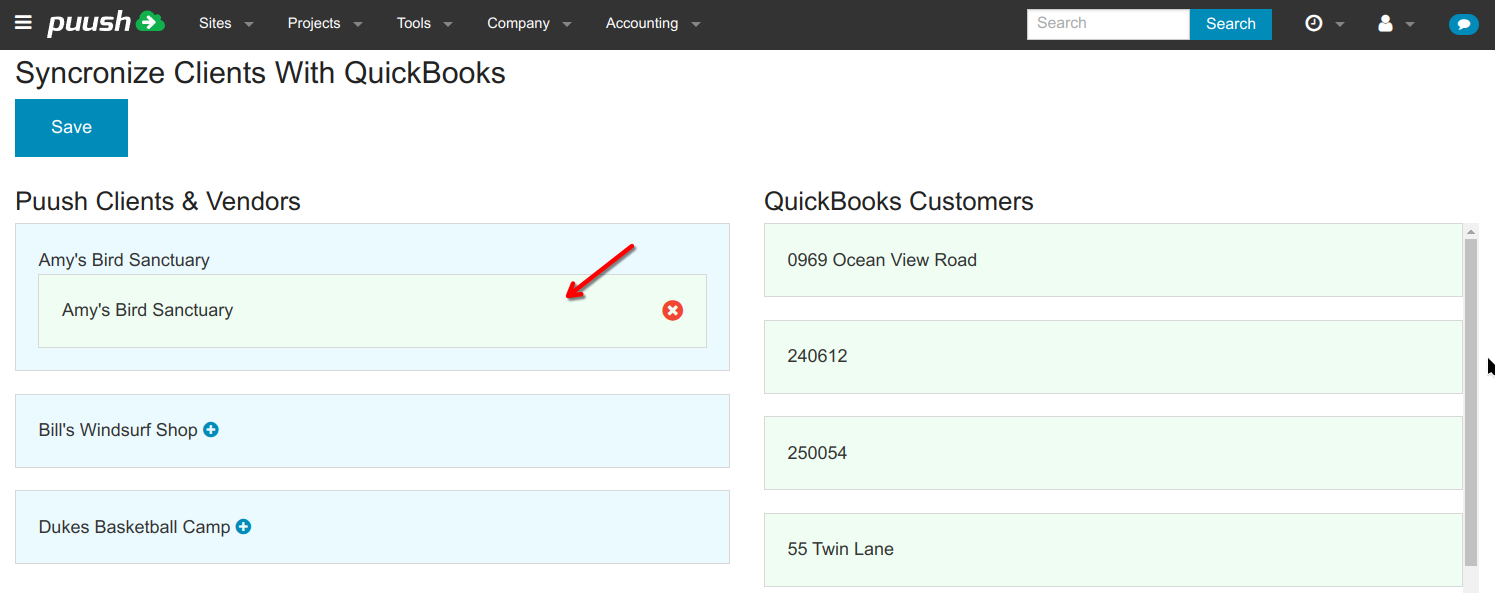 - You will see your Puush clients & vendors listed in the left column in blue, and QuickBooks customers in the right column in green. To match a customer with a Puush client, click on the customer on the right to highlight it.