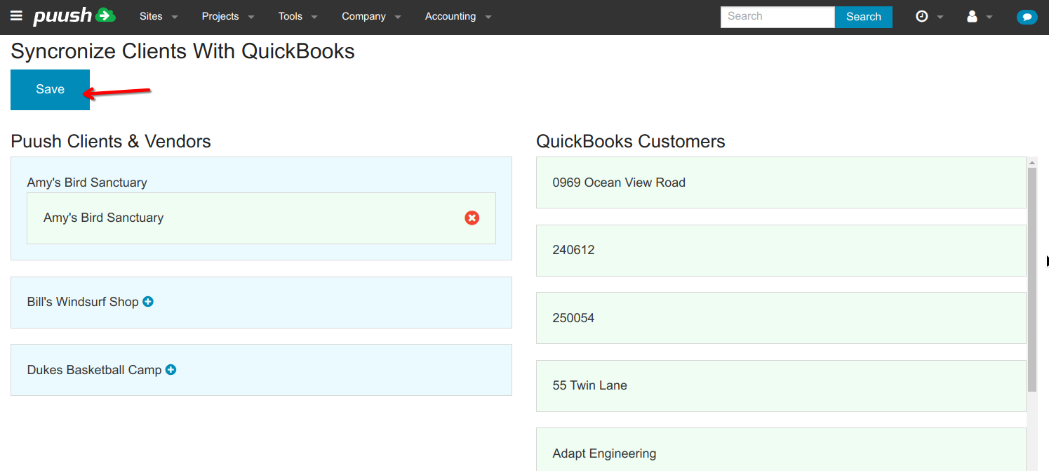 - Navigate from the top menu to "Accounting -> Overview". Expand the "Clients & Vendors" section and hit the "Sync Clients With QuickBooks" button.